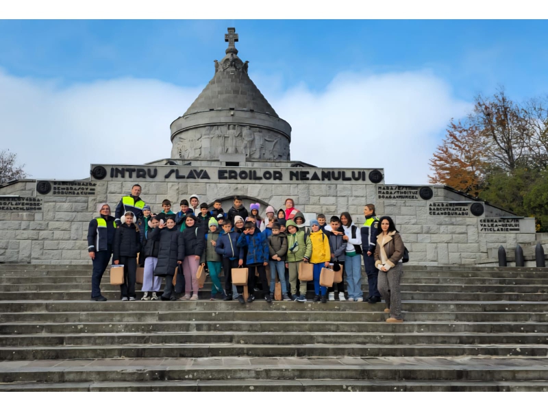 Activitatea a continuat în Gara Focșani, unde cei 31 de elevi, alături de două cadre didactice, au călătorit cu trenul până la Mărășești, împreună cu polițiștii. Aici, aceștia au vizitat Mausoleul Eroilor de la Mărășești, unde au aflat informații despre semnificația istorică a monumentului și importanța cinstirii memoriei eroilor neamului.